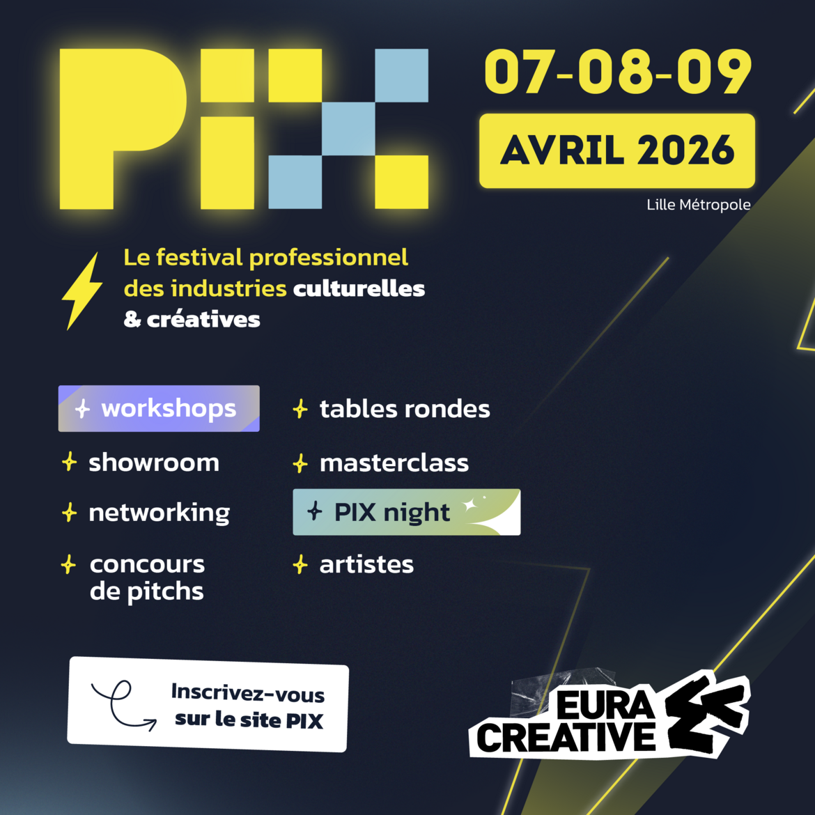 Du 8 au 9 avril, le festival PIX organisé par EuraCreative (Plaine Images), propose un showroom dédié aux innovations, des conférences animées par des intervenants et des intervenantes de renom, ainsi que des espaces de rencontres. L’occasion de découvrir nos activités et expertises, tester nos démonstrateurs et discuter de vos projets !